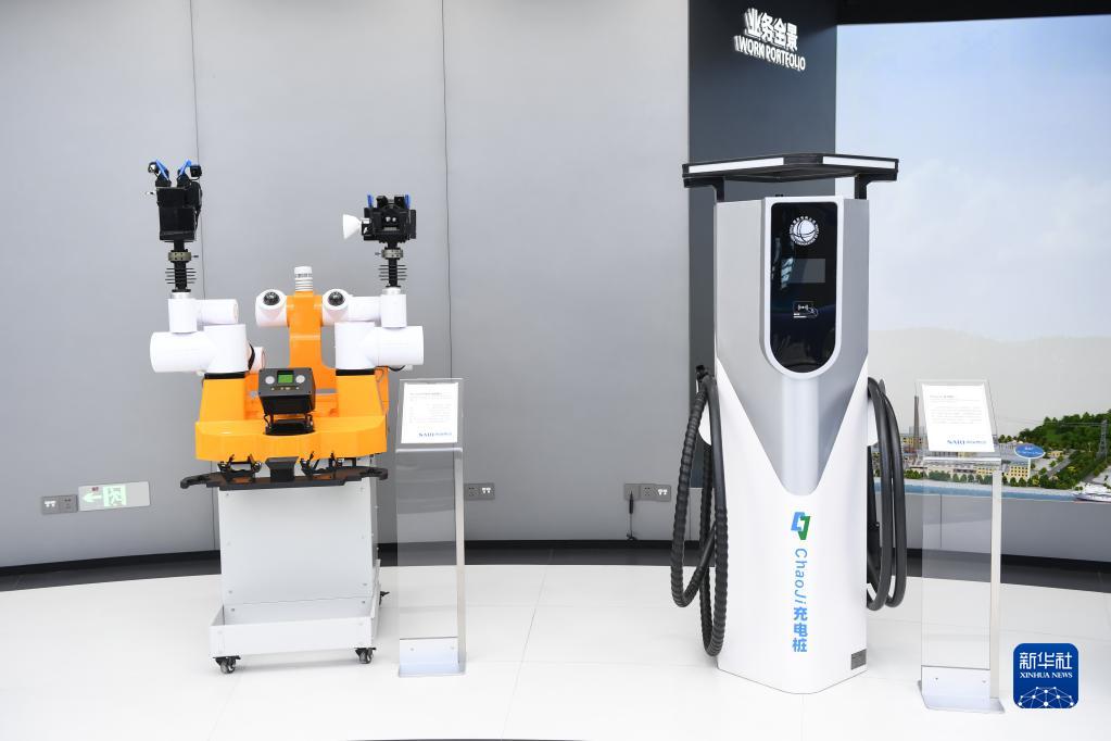 南瑞集團有限公司展廳內展示的充電樁和帶電作業機器人(7月7日攝)。