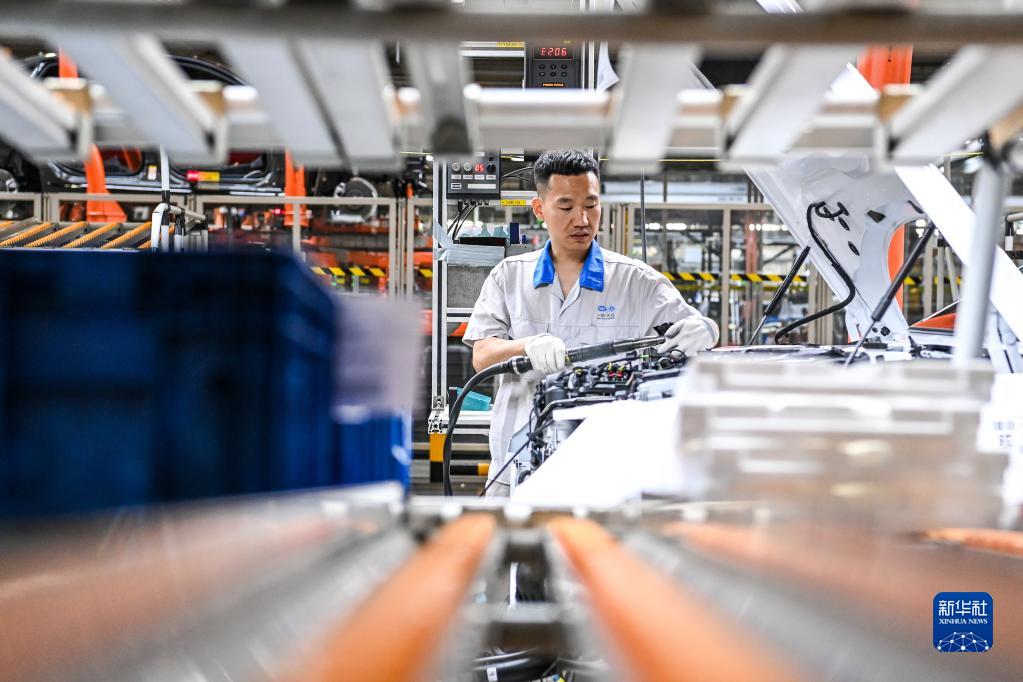 在位于吉林長春的一汽-大眾長春生產整車制造一部總裝一車間,工人在生產線上裝配車輛(6月12日攝)。