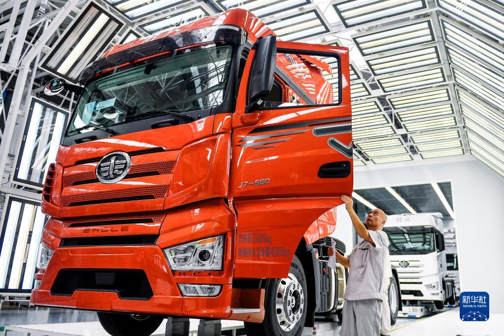 在位于吉林長春的一汽解放J7智能工廠內,工作人員對裝配好的車輛進行靜態檢查(6月27日攝)。