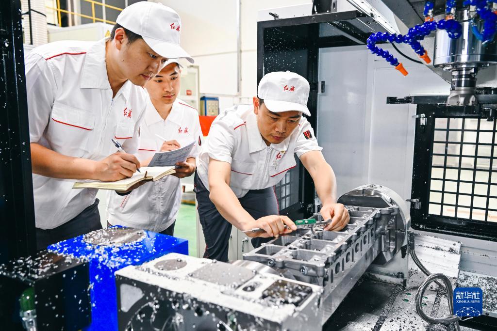 楊永修(右)在檢查試制零部件的精度(6月8日攝)。楊永修是中國一汽研發總院高級技師,他攻克了高端發動機精密制造過程中的多項難關,獲得全國技術能手、全國五一勞動獎章等多項榮譽。