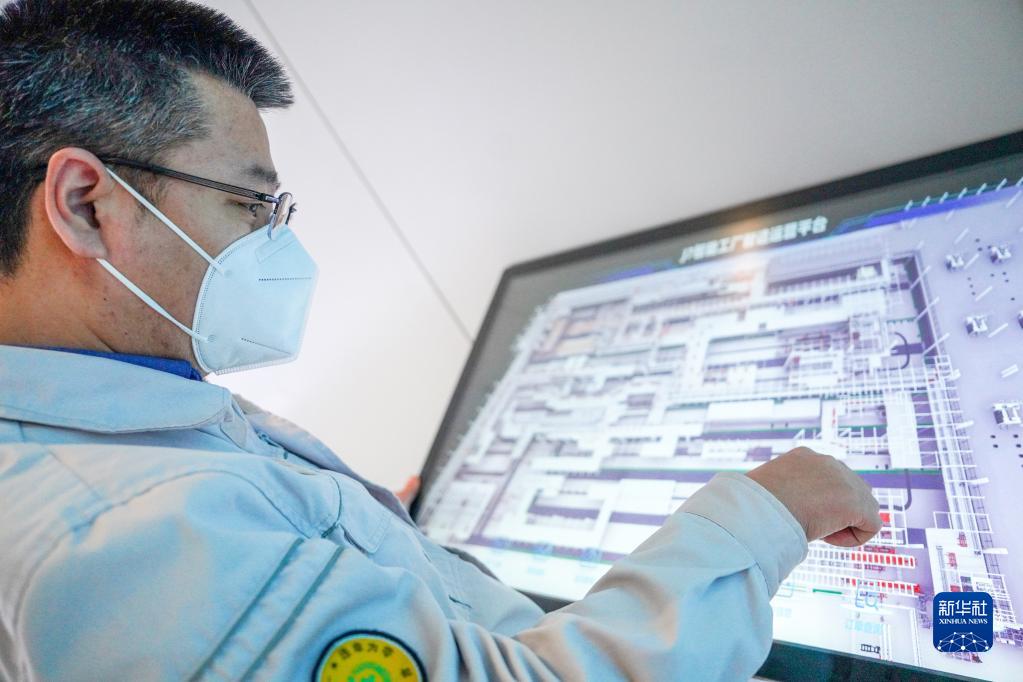 在位于吉林長春的一汽解放J7智能工廠內,車間主任王一強在智造運營平臺的電子屏上查看生產情況(2022年12月27日攝)。