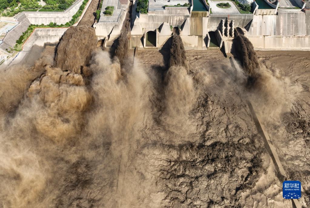這是7月7日拍攝的黃河小浪底水庫排沙出庫場景(無人機照片)。