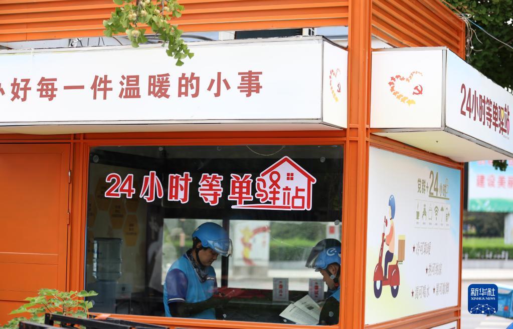 7月7日,在山東省臨沂市郯城縣郯城街道一處24小時“等單驛站”,外賣配送員在納涼等單。