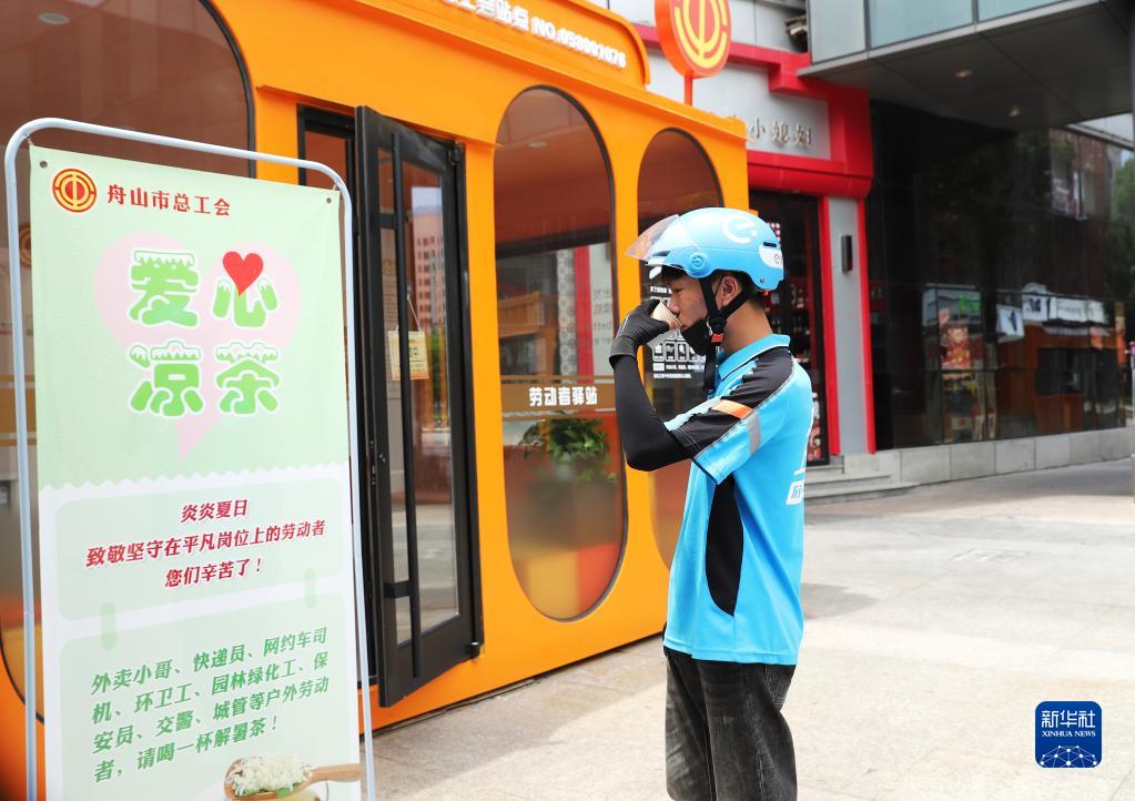 7月7日,外賣配送員在浙江舟山市一處“勞動者驛站”飲用“愛心涼茶”。