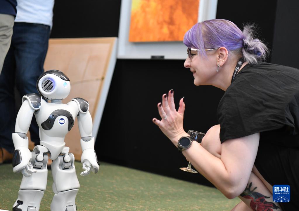 7月7日,在瑞士日內瓦“人工智能造福人類全球峰會”上,一名參會者與機器人互動。