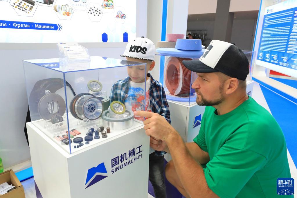 7月1日,在白俄羅斯明斯克中白工業園,參觀者在展覽會上觀看展品。