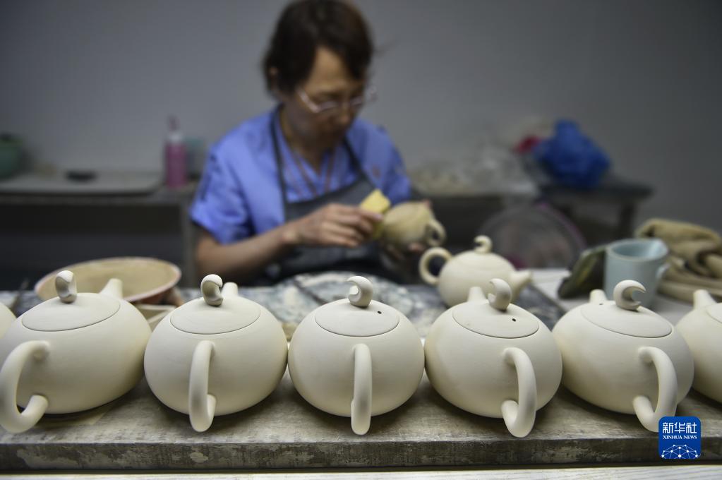 7月6日,工作人員在河南省汝州市玉松汝瓷有限公司的車間里加工汝瓷產品。