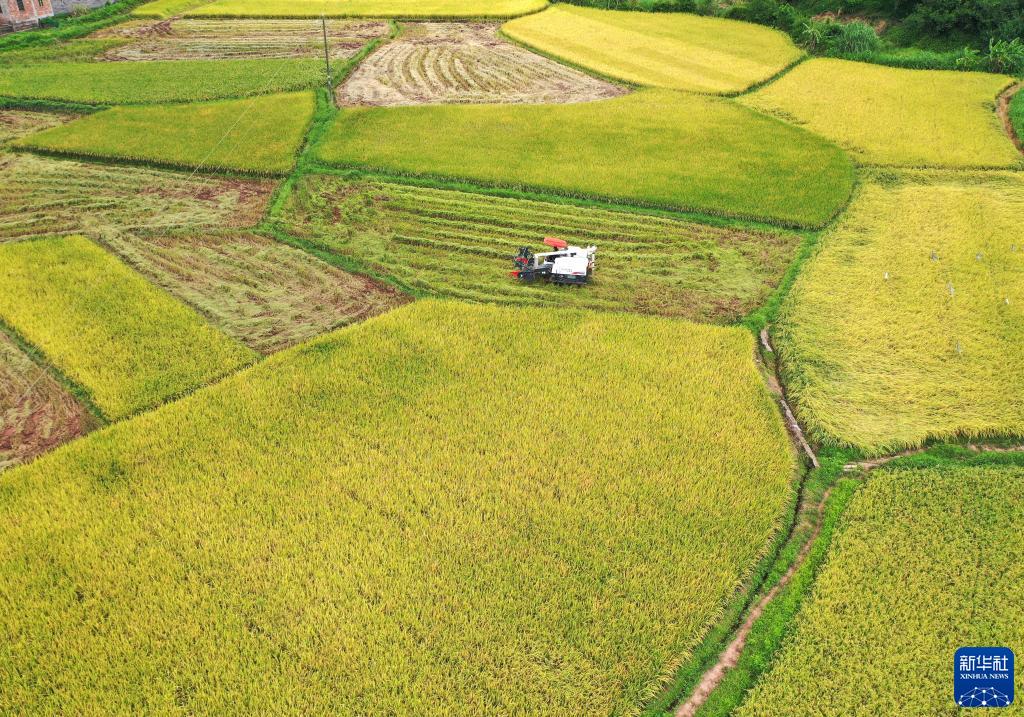 一臺收割機在南寧市橫州市新福鎮搶收早稻(7月7日攝,無人機照片)。