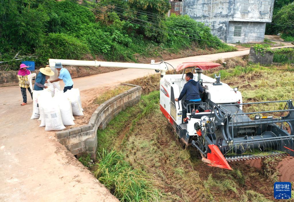 一臺收割機在南寧市橫州市新福鎮卸下剛剛收割的早稻(7月7日攝,無人機照片)。