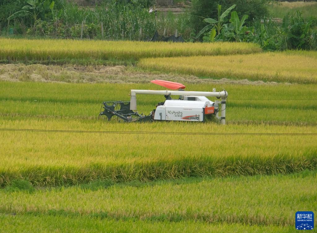 一臺收割機在南寧市橫州市新福鎮搶收早稻(7月7日攝)。