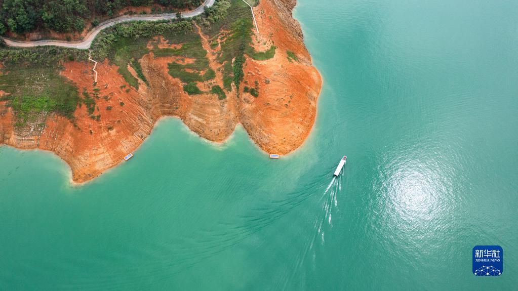船只行駛在萬峰湖南盤江鎮水域(7月4日攝,無人機照片)。