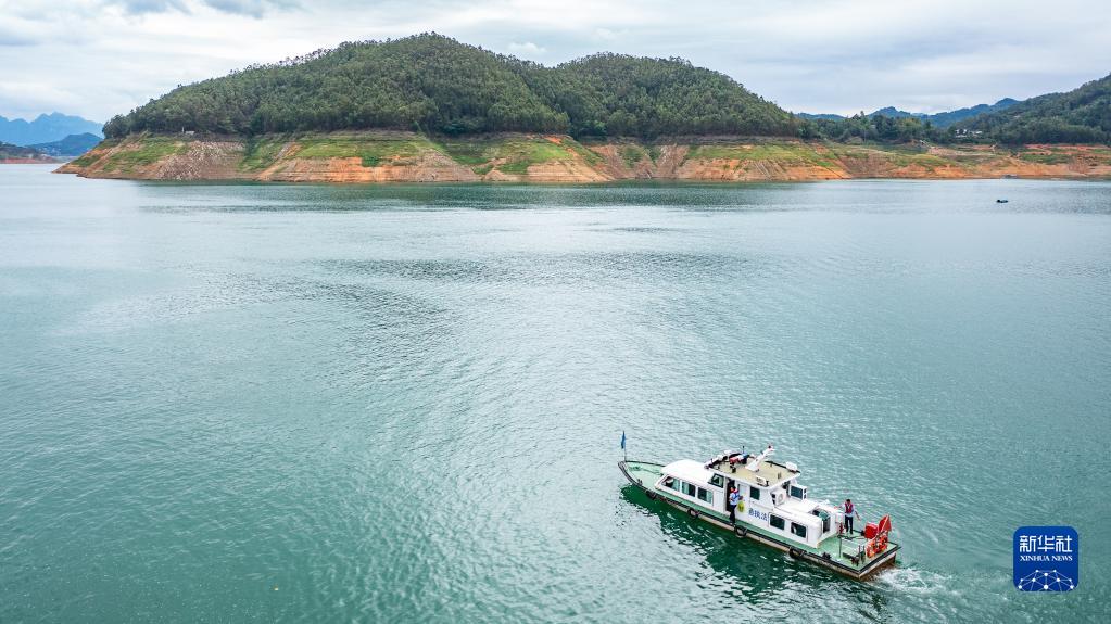 貴州省興義市交通運輸海事中隊的工作人員駕駛執法船在萬峰湖水域巡檢(7月5日攝,無人機照片)。