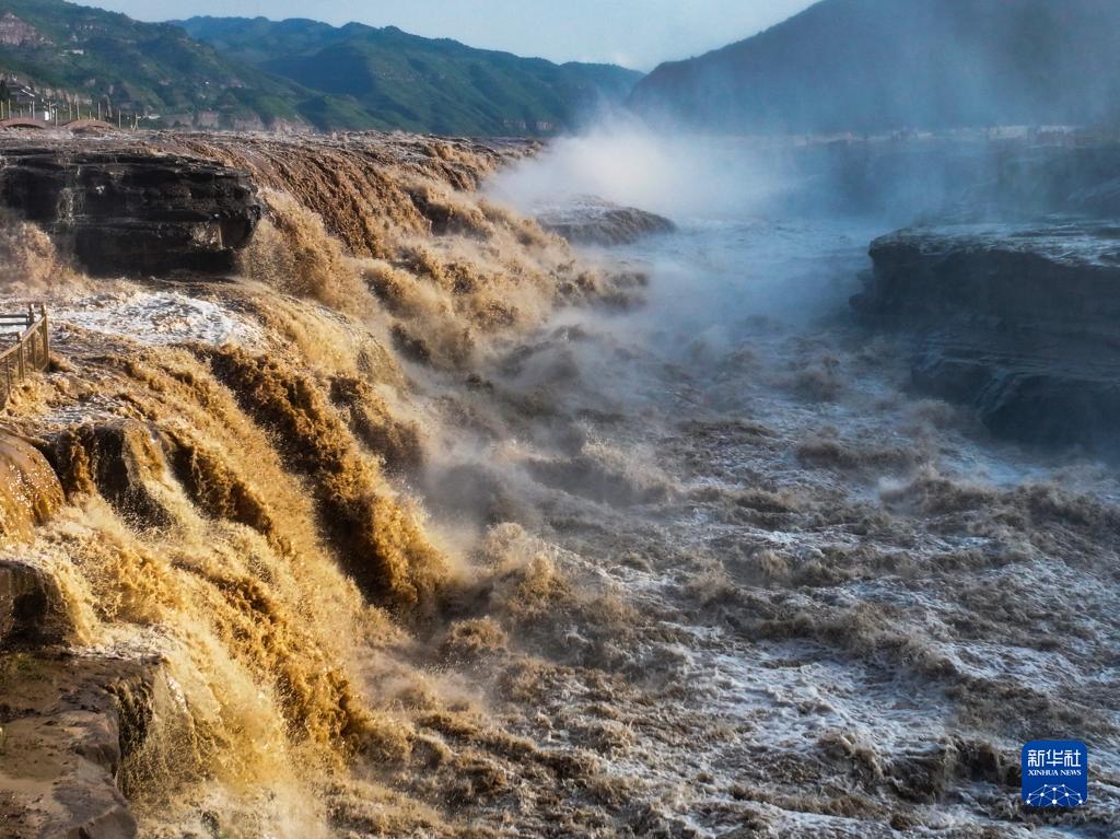 近日,黃河壺口瀑布水流量增大,水勢洶涌澎湃,蔚為壯觀。