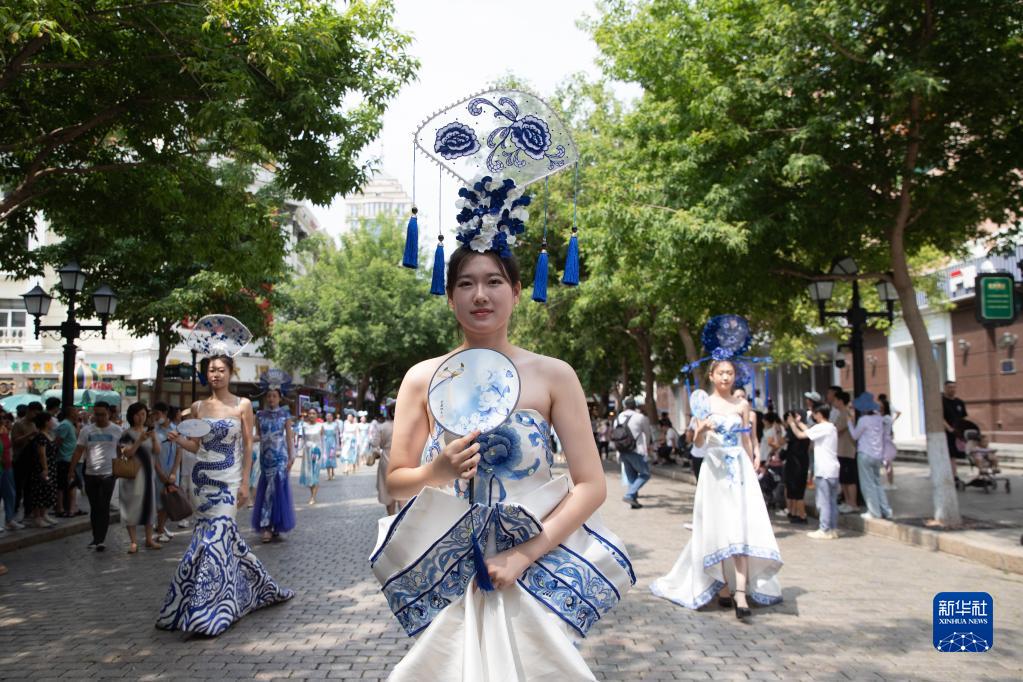 7月8日,在哈爾濱市中央大街上,人們參加巡游慶祝。