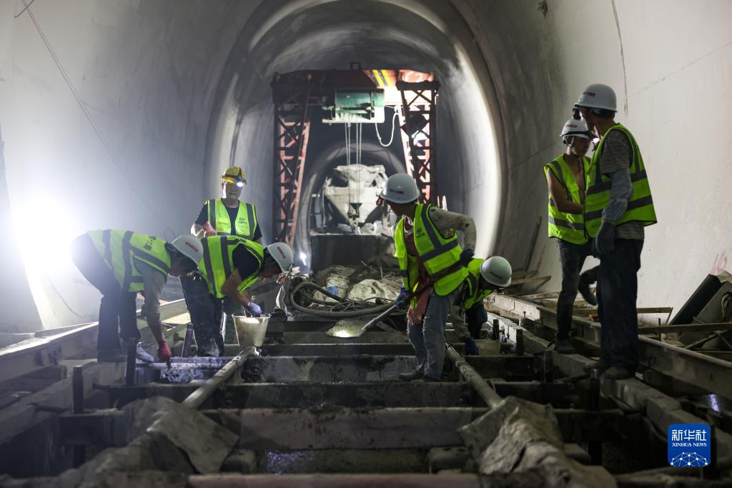 7月8日,在滇藏鐵路麗香段哈巴雪山隧道內,建設者進行施工。