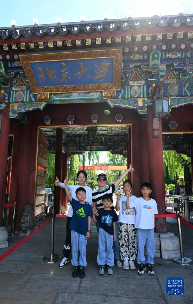 7月8日,來自廣東深圳的游客在北京大學西門留影。