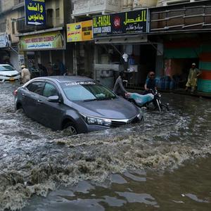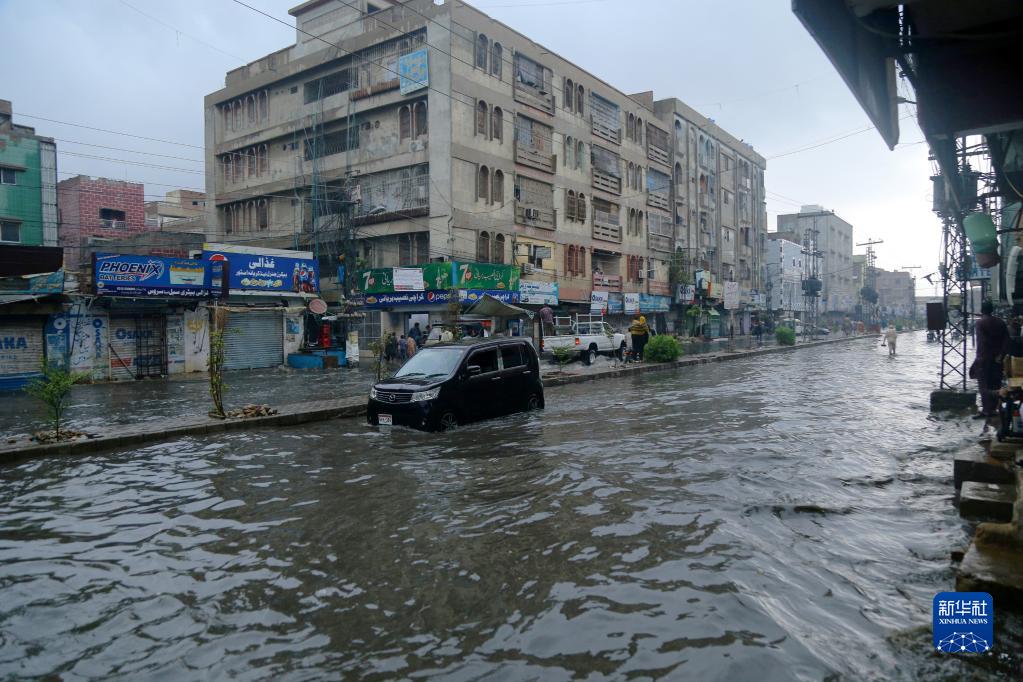 7月7日,車輛在巴基斯坦海得拉巴積水的道路上行進。