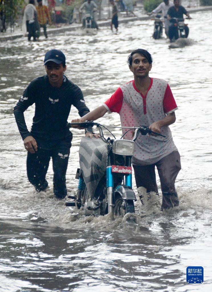 7月7日,人們在巴基斯坦海得拉巴積水的道路上行進。