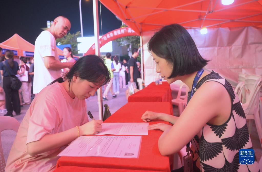 7月8日,一名大學畢業生(左)在“好年華 聚福州”高校畢業生就業夜市現場與企業代表簽訂就業意向書。