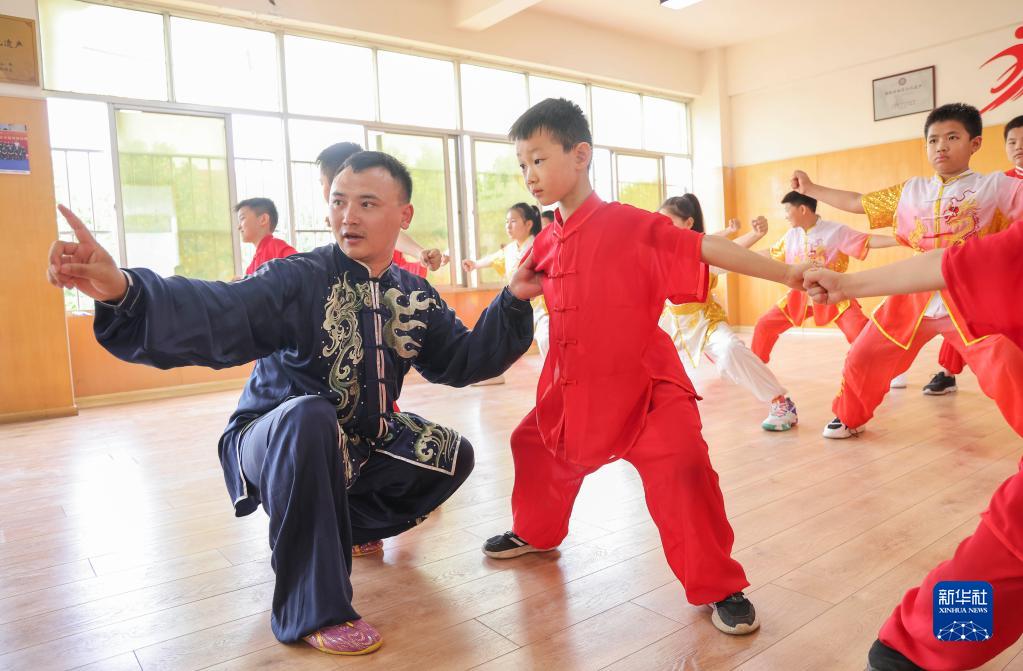 7月8日,在山東省臨沂市蘭山區一家武術館,武術老師指導學員練習拳法動作。