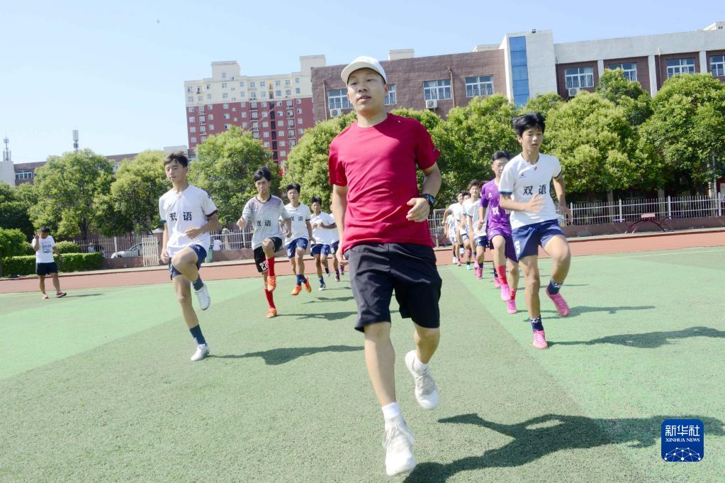 7月8日,在河南省駐馬店市汝南縣雙語學校,來自湖南大學的志愿者帶領孩子們一起做運動。