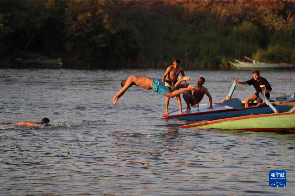 7月8日,在埃及蓋盧比尤省,人們在尼羅河里戲水避暑。