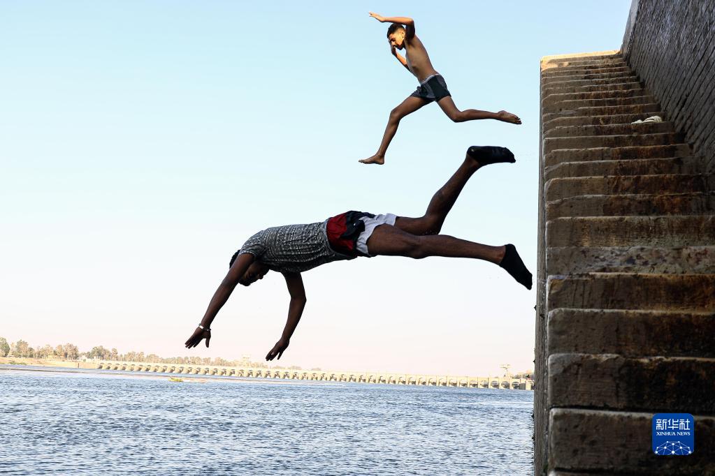 7月8日,在埃及蓋盧比尤省,人們跳入尼羅河里戲水避暑。