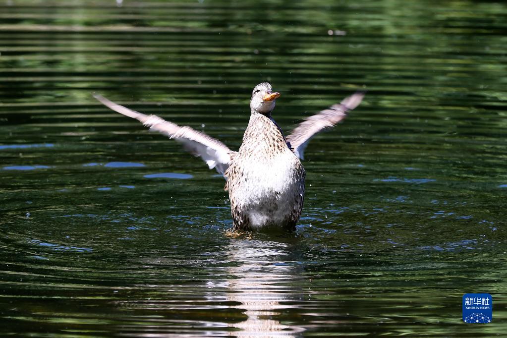 7月7日,一只鴨子在英國倫敦圣詹姆斯公園內戲水。