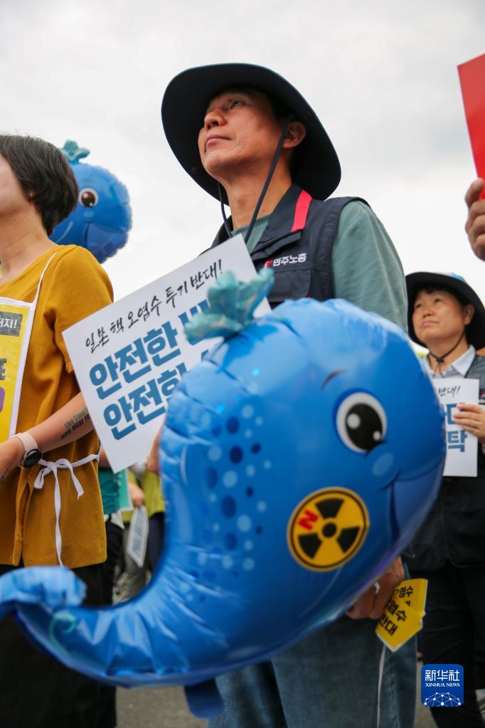 韓國市民團體“阻止日本放射性污染水排海全國行動”8日舉行今年5月以來的第四次大規模集會。人們手持鯨魚模樣的藍色氣球,舉著“反對排放放射性核污染水”等標語,對日本政府不顧鄰國及國際社會擔憂執意推動核污染水排海計劃表示憤怒。