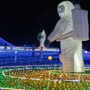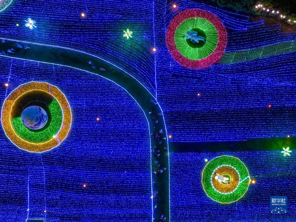 7月8日晚,安徽省合肥市肥東縣橋頭集鎮歡樂森林景區,人們在欣賞燈展(無人機照片)。