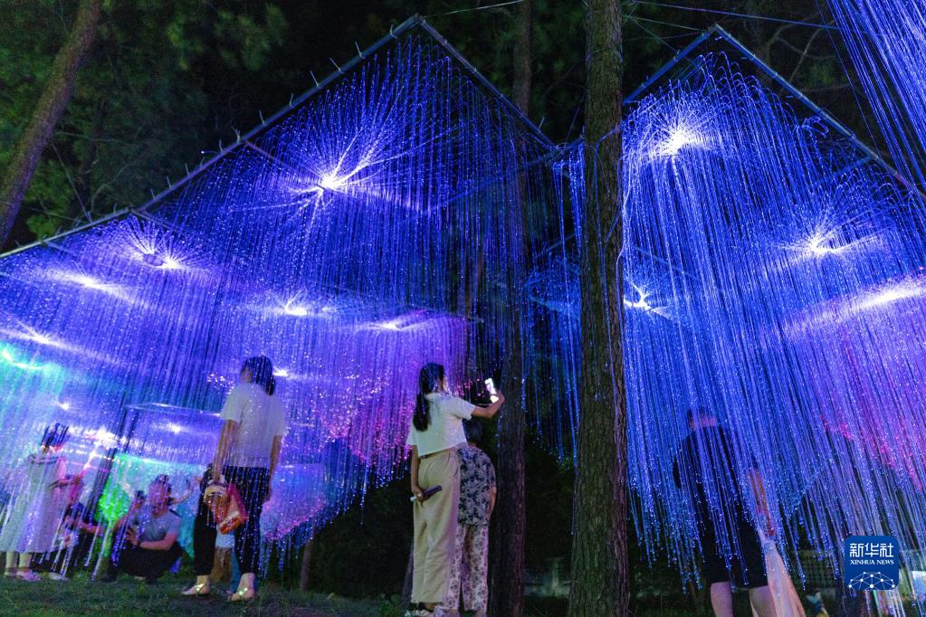 暑期,安徽省合肥市肥東縣橋頭集鎮歡樂森林景區內游人如織,該景區7月8日起至8月31日策劃炫彩燈展,結合美食節等夜間活動,點燃了酷暑之下的鄉村游新熱點。