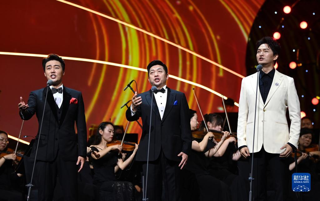 7月8日,在西安“感悟初心?與黨同行”經典歌曲交響音樂會現場,演唱者田彥(中)、張英席(左)、王凱在演唱歌曲《新的天地》。