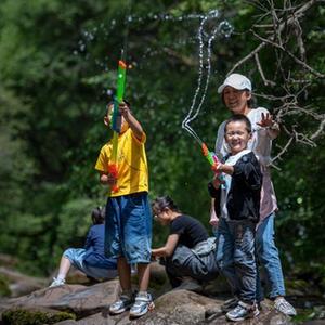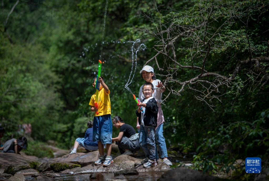 7月8日,家長帶著孩子在六盤山國家森林公園玩耍。