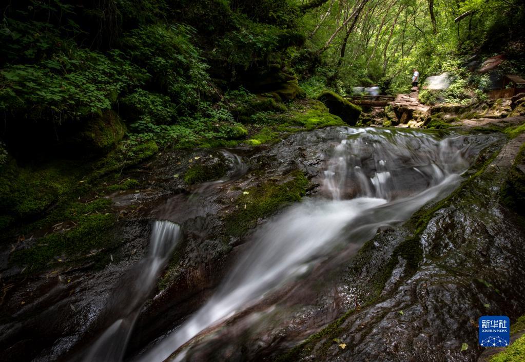 7月8日,游客徒步經過六盤山國家森林公園內一處溪流。
