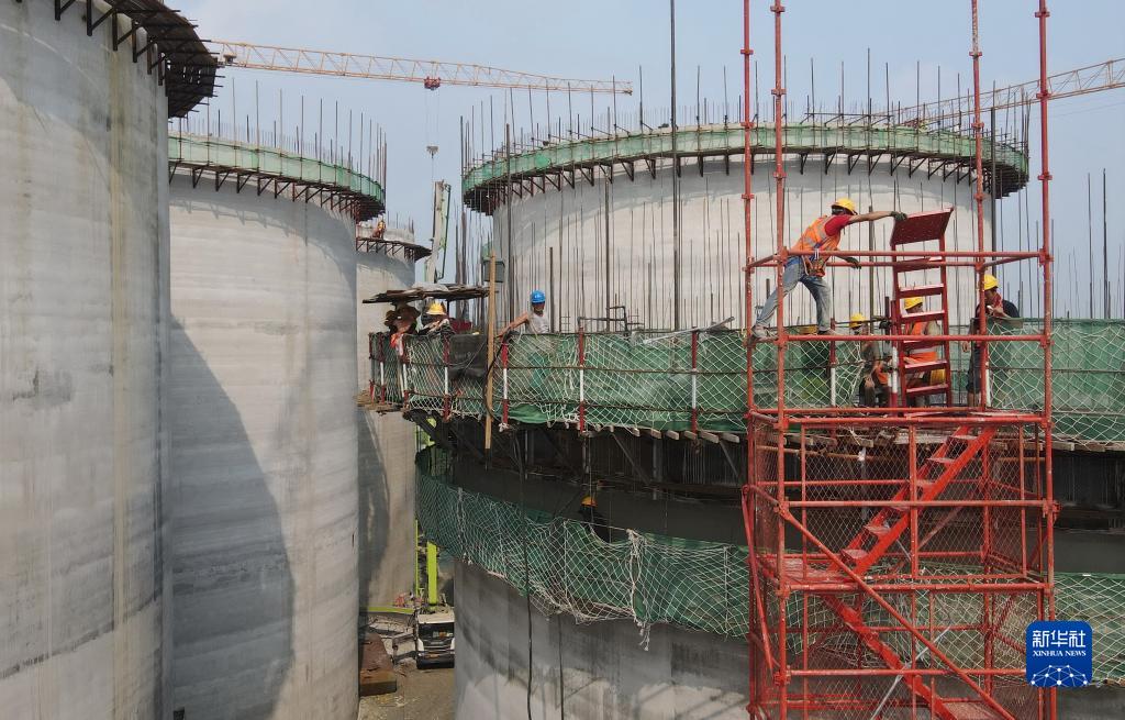7月8日,工人在糧食安全應急儲備及食品深加工全鏈化綜合生產基地項目建設工地施工(無人機照片)。