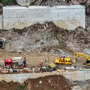7月9日,救援人員在滑坡現場勘察(無人機照片)。