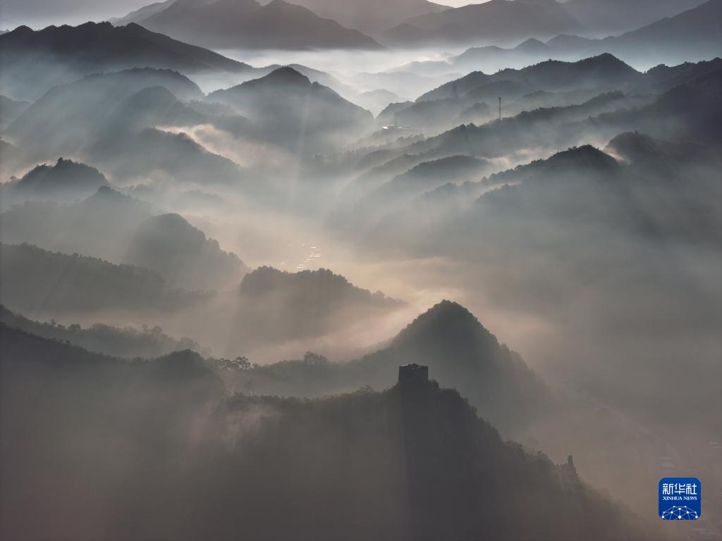 當日清晨,遷西縣境內的長城附近晨霧繚繞,長城、山峰、村莊、晨霧等呈現出壯美的水墨畫卷。