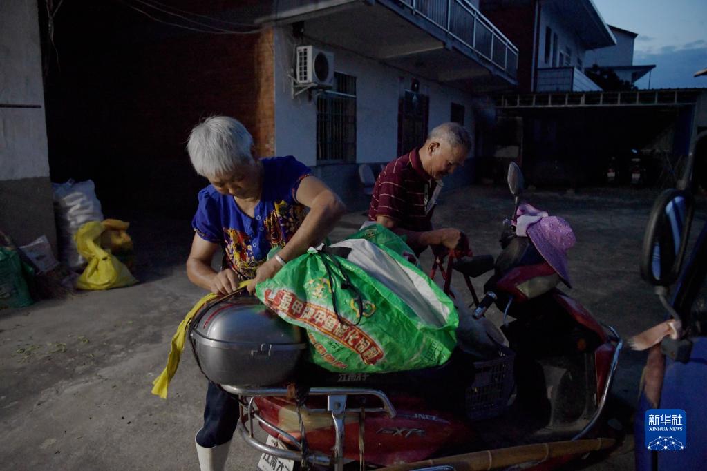 凌晨5時,在江西南昌縣向塘鎮浹溪村,菜農余春蘭(左)將整理好的蔬菜固定在摩托車上準備騎車去趕公交車(7月5日攝)。