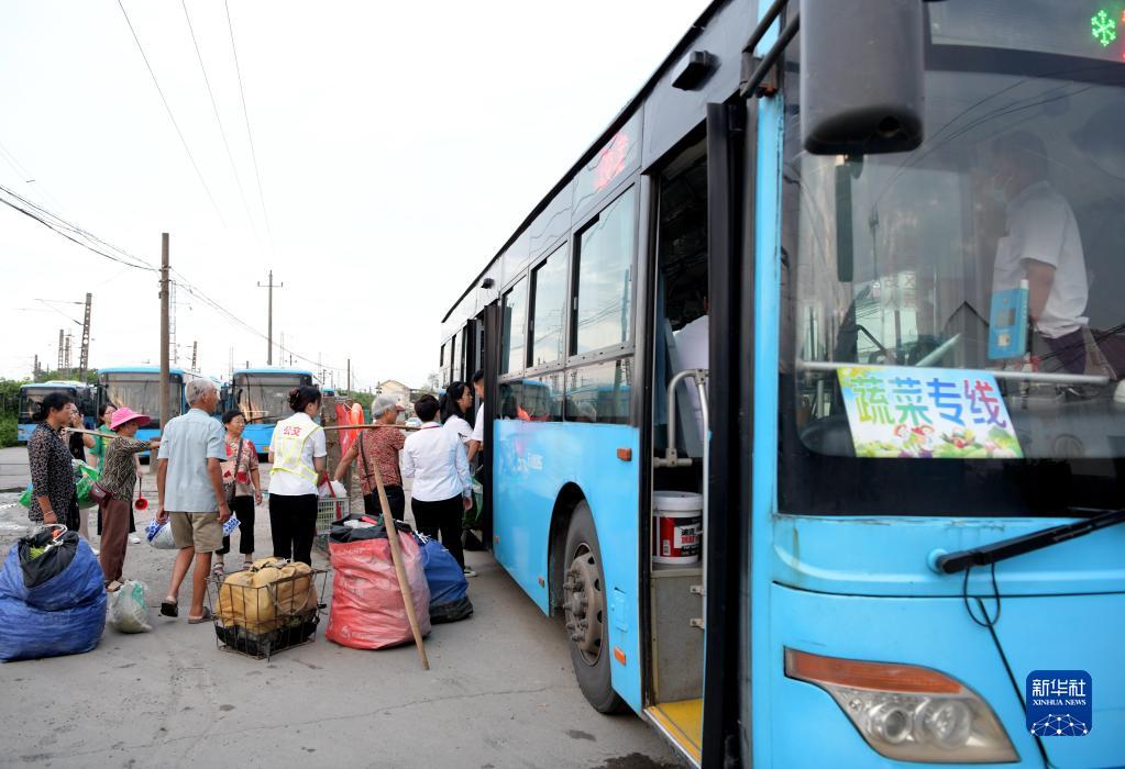 早上5時30,在江西南昌縣向塘鎮浹溪村179路公交車始發站,菜農們開始排隊上車(7月5日攝)。