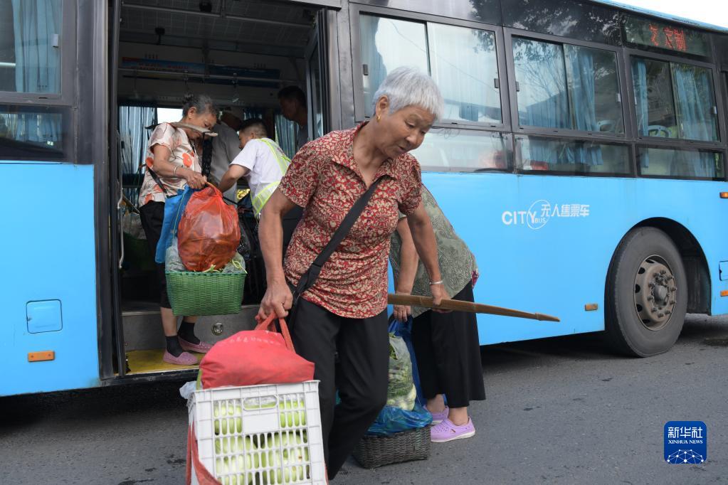 菜農余春蘭到站下車,準備前去賣菜(7月5日攝)。