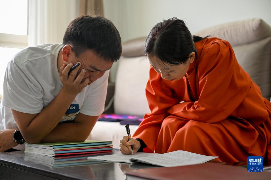 7月2日,巴達瑪斯仁(左)在妻子烏日汗的幫助下學習。今年6月,巴達瑪斯仁與烏日汗結婚,并積極準備公務員考試。