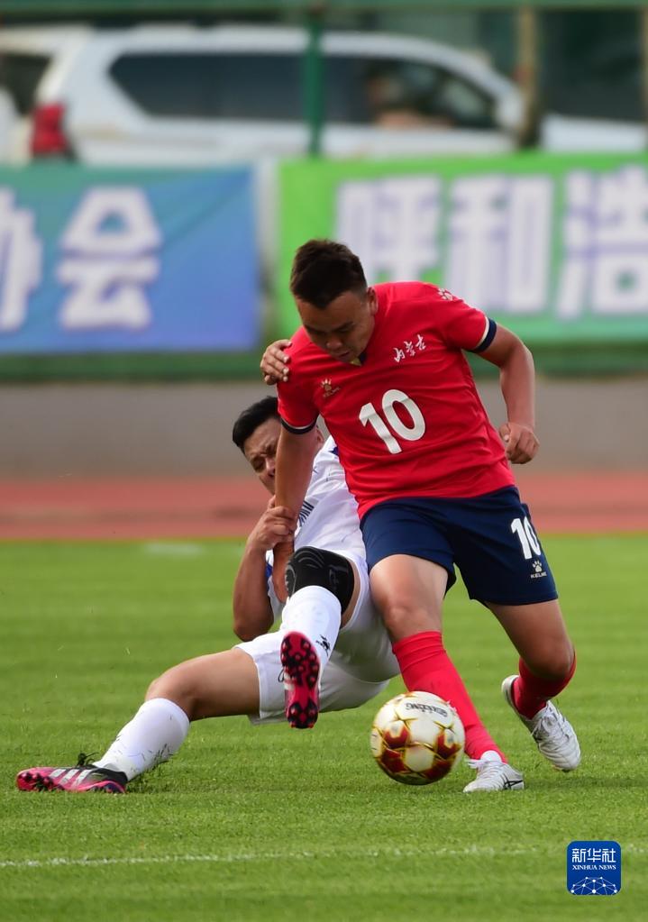2021年7月20日,在第十四屆全國運動會群眾組十一人制足球男子農村鄉鎮組的一場比賽中,巴達瑪斯仁(右)帶球突破。