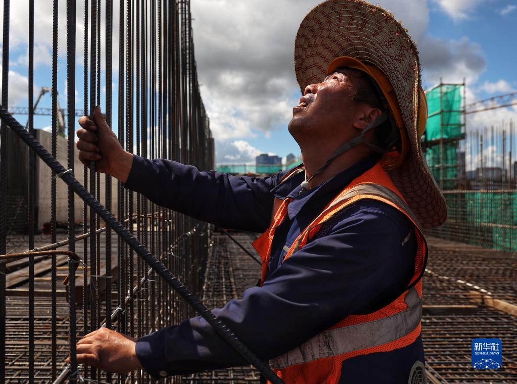 7月9日,中鐵上海局施工人員在南山水廠建設現場綁扎鋼筋。