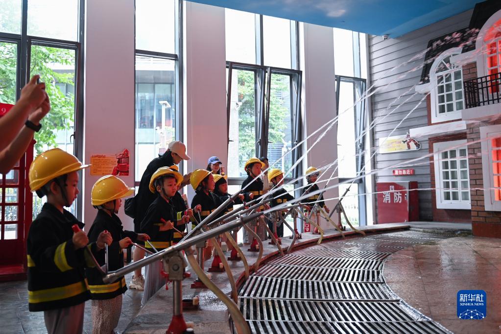 7月9日,小朋友在體驗“消防員”滅火救援。