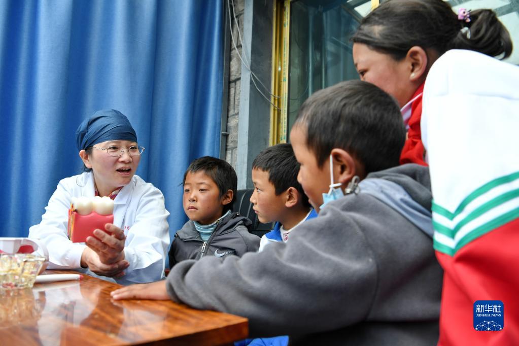 近日,上海市徐匯區牙病防治所的醫務工作者來到西藏浪卡子縣普瑪江塘鄉,為當地居民普及口腔保健知識并進行義診服務。普瑪江塘鄉海拔5373米,是我國海拔最高的鄉。