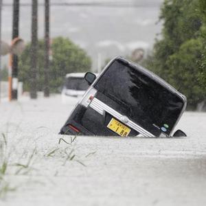 這是7月10日在日本福岡縣久留米市拍攝的被大雨圍困的汽車。