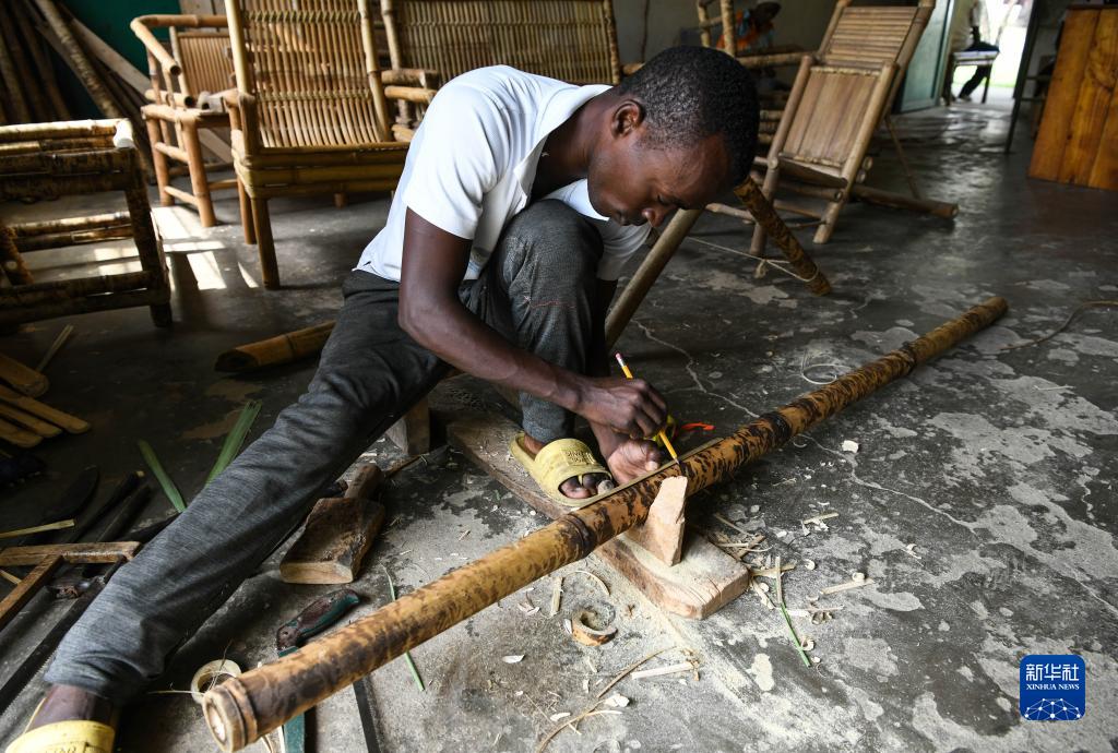 6月21日,在位于布隆迪經濟首都布瓊布拉的卡蒙蓋手工業培訓中心,學員在生產車間制作竹家具。