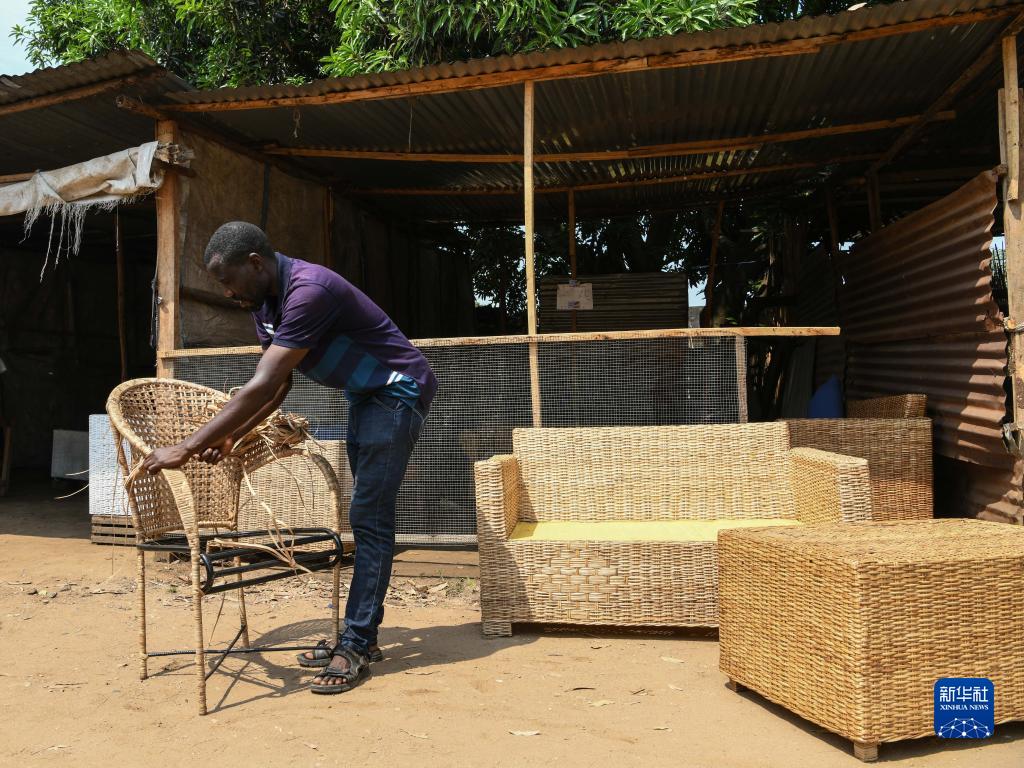6月21日,在布隆迪經濟首都布瓊布拉,卡蒙蓋手工業培訓中心青年培訓項目結業學員恩達伊施米耶·塞萊馬尼在自己開設的竹藤產品商鋪忙碌。