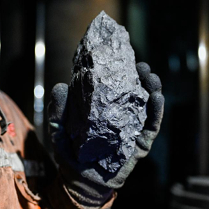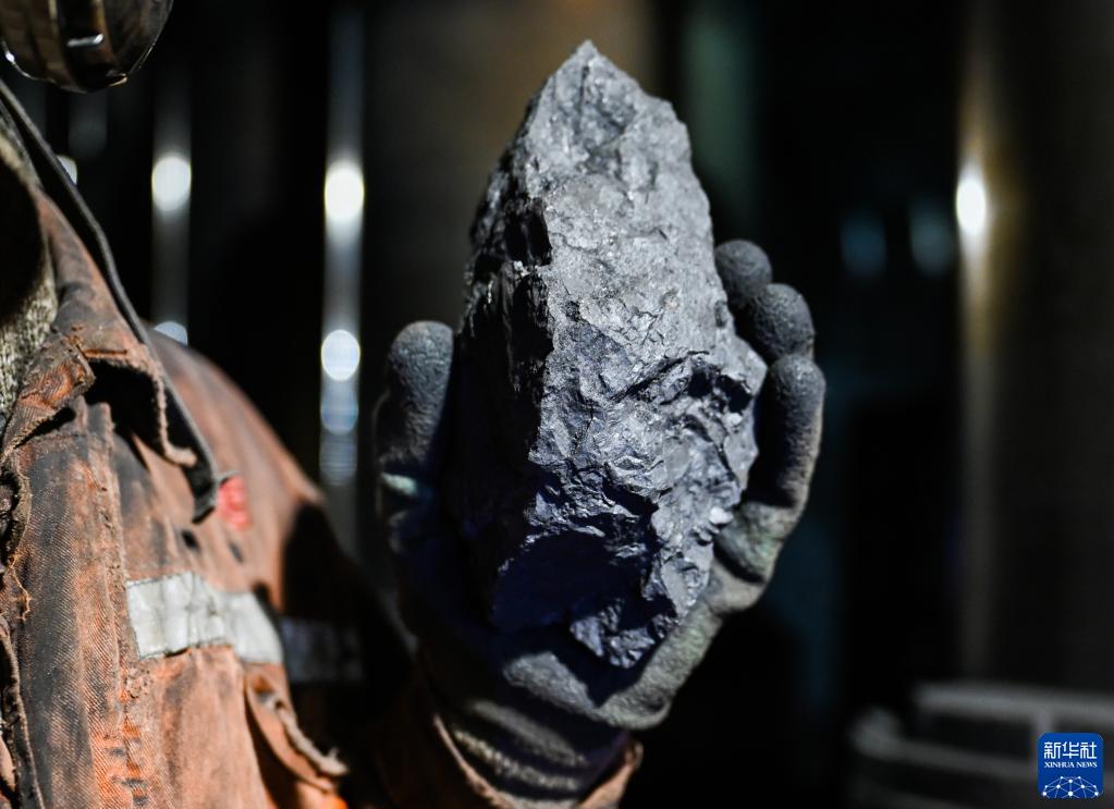 7月8日,在大唐龍王溝煤礦井下近400米的作業面上,一名工人在展示一塊煤炭。