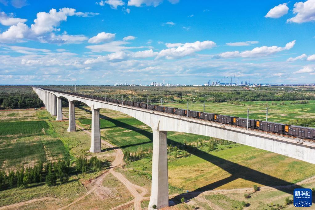 這是在準格爾旗境內拍攝的運煤專列(7月8日攝,無人機照片)。